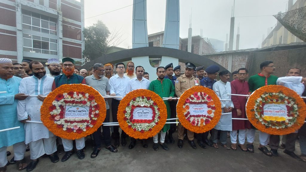 জাতীয়তাবাদী দল থানা ও পৌর বিএনপির পক্ষে এফ এম শামীম আহসান, জেলা বিএনপি নেতা মনিরুল হক ফরাজী, পৌর বিএনপির সভাপতি শিকদার ফরিদুল ইসলাম, সাধারণ সম্পাদক আসাদুজ্জামান মিলন, যুবদলের পক্ষে বিএম রেজাউল করিম সোহাগ, স্বেচ্ছাসেবক দল, শ্রমীক দল, ছাত্রদলসহ অঙ্গসংগঠনের নেতৃবৃন্দ পৃথক পৃথক পুষ্প মাল্য অর্পণ করেন। মুক্তিযোদ্ধা সংসদদের পক্ষে উপজেলা মুক্তিযোদ্ধা কমান্ড আহবায়ক মো. শাহ আলম বাবুল। এ ছাড়াও উপজেলা স্বাস্থ্য কমপ্লেক্স, ফায়ার সার্ভিস, পৌরসভা, সরকারি বেসরকারি বিভিন্ন শিক্ষা প্রতিষ্ঠান, বাংলাদেশ স্কাউটস, শিক্ষক সমিতি মাল্য দান করেন। পরে বীর মুক্তিযোদ্ধা স ম কবির আহম্মদ মধু, বীর প্রতীক আলী আহম্মেদের কবর জিয়ারত করেন উপজেলা প্রশাসন।